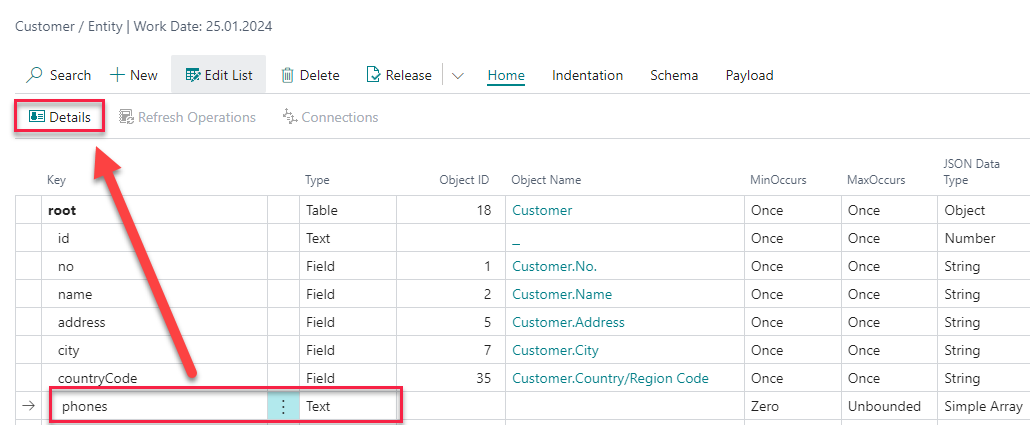zip node and match it with correct field in Business Central.countryCode node optional by setting MinOccurs to Zero.Don't forget to Release the entity after making changes and then use the function Refresh Operations on your entity: