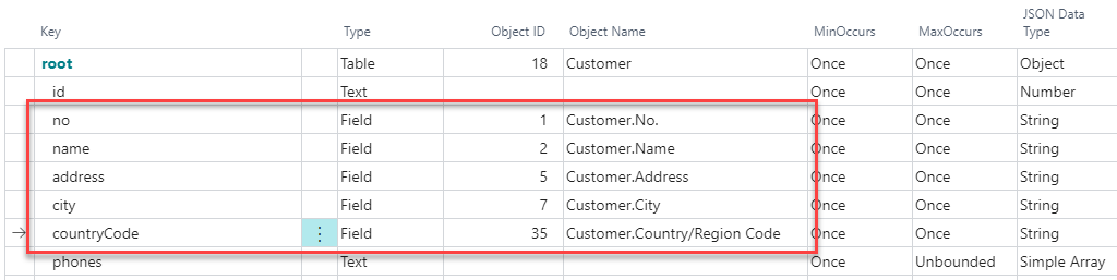 phones is optional – if a Customer in an external system does not have any phone number, the node will be missing in JSON body. With default settings this may throw an error, but you can mark the node as optional by setting MinOccurs to Zero: